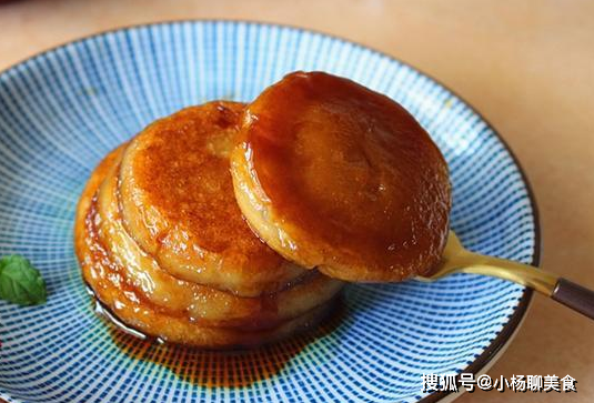 第三步:煎制。和煎餅時候的步驟差不多,等到鍋熱了以後放入之前的成品煎制,注意要時不時的翻下麵,等到其兩面都變的有點焦黃的時候,把糖漿淋入。之後慢慢的等待糖漿變硬。這時將糍粑產出裝盤,淋上多餘的糖漿作為調味,到這裡就大功告成了。