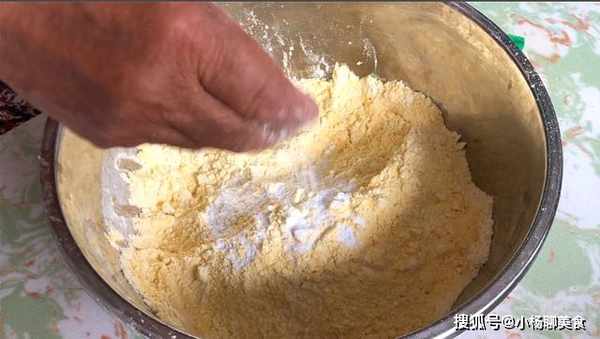首先是準備工作,準備四份玉米麵。其中三分粗玉米麵用來做皮兒的;一份細玉米麵用來做陷。然後加入適當的溫水以及小蘇打,然後就是發酵的過程,咱們靜候半小時左右。