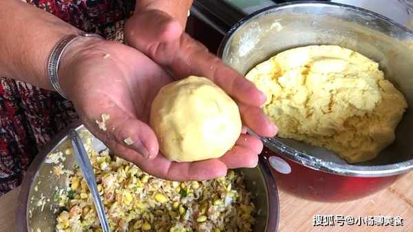 在這期間就是咱們準備餡兒的時候。首先就是豆芽,想必大家都覺得很新鮮,畢竟豆芽做餡兒很多人還是頭一回聽說。豆芽切碎備用,然後把咱們經常用來做陷的白菜也切碎備用,這樣菜餡兒不那麼單一,口味也會更好。然後在鍋中加油,取出適量細玉米面兒和白麵粉做成面皮兒,然後切成面丁,丟入鍋中,放入小葱,炸至金黃色。這時候,在取兩個雞蛋,一起翻炒。最後加入適量食鹽和五香粉,翻炒均勻起鍋。這樣,香氣逼人的餡兒就做好了。