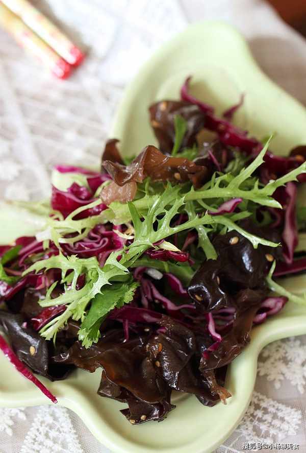 用料:紫甘藍、黑木耳、熟芝麻、香菜、鹽、生抽、醋、糖、辣椒油、花椒油