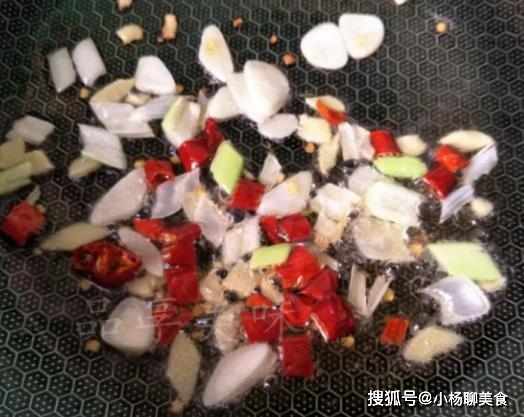 步驟四:起鍋熱油,油熟後放入葱碎、薑絲、蒜末、幹辣椒煸炒出香味。