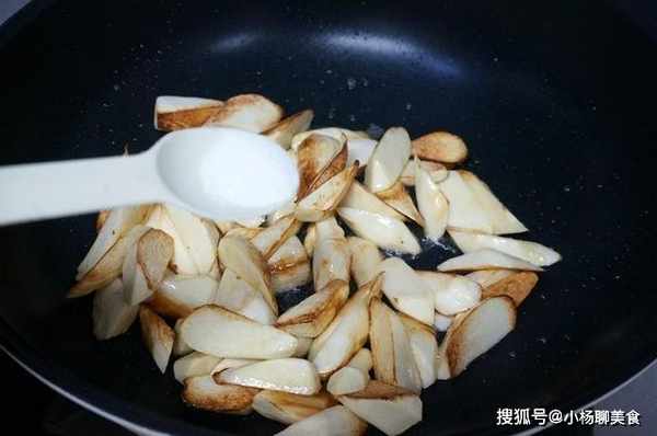 8.用同一把勺子,舀一勺白糖入鍋中,翻炒幾下,讓糖融化均勻分佈在茭白表面;