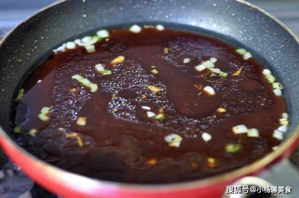 4.另起鍋,油熱了,放入蔥花爆香,將生抽、蚝油、糖、蒜、澱粉加少許水混合均勻,倒入鍋中。