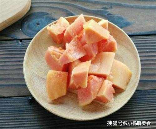步驟2:接著準備木瓜,如果人多就需要一個,人少就半個就行。將木瓜先把皮去掉,然後清洗乾淨外表,將圓滾滾的木瓜對半劈開,接著將木瓜中的籽去掉,同時將木瓜再次清洗一次。最後將木瓜切成塊,放置在一旁。