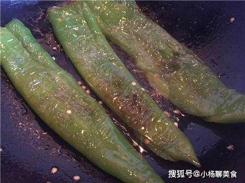 步驟1:拿出辣椒,將辣椒先用清水清洗一下,然後將辣椒的蒂把連帶著籽一起扯起來,接著將辣椒辣椒放在案板上。用刀背就所有的辣椒都壓一下,壓扁放在一旁備用。接著就是像煎爆辣椒一樣的,開始煎辣椒。在鍋中放上一點油後,將辣椒放在鍋中開始煎。