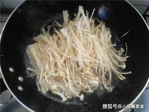 步驟2:接著將鍋清洗乾淨後就在鍋中倒入適量的水,等到鍋中的水被燒開後就可以將金針菇倒入鍋內,同時如果有其他的食材也可以倒入鍋中一起。等到金針菇被簡單的焯熟後就可以快速的撈出,將它瀝幹水分後就放在碗中備用。