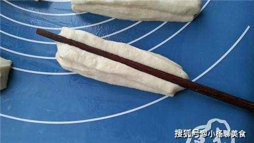 步驟3:將醒好的麵團拿出後,先弄成長條,然後切成細條,接著將切好的細條,兩個兩個的疊在一起,然後拿出筷子在上面一壓。接著在鍋中倒入油,並且將油條的胚子放入油鍋中。接著將它用中火慢慢的炸上,直到炸到金黃色之後就可以撈出,等到全部都炸好之後就可以開吃了。