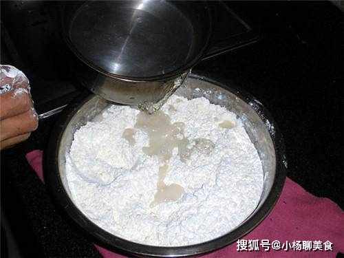 步驟1:拿出300g的小麥麵粉,然後將麵粉倒入事先準備好的容器中,接著在麵粉中加上一點點的鹽,同時在麵粉中弄出一個洞,將酵母粉放入埋好。然後倒入泡打粉以及溫水,接著用筷子將麵粉快速的攪拌一些,攪拌到盆中的麵粉都濕了,沒有乾粉。