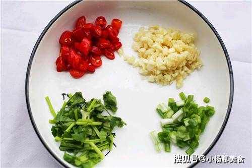 步驟2:拿出6顆新鮮的大蒜,先用傳統的方法去掉皮之後,接著用清水洗乾淨,並且將這些切成蒜末。同時在拿出幾根葱,同時的切掉多餘的部分後,切成段,並且拿出3個小紅椒,去掉蒂把之後,洗乾淨切好,最後洗上香菜。