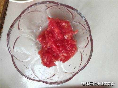步驟1:按照人數拿出幾個蕃茄,我是用的1個蕃茄,然後將蕃茄放在水中清洗乾淨,並且放在菜板上快速的切成片,之後繼續切成丁備用。我為了口感更加的好,是將蕃茄放在鍋中煮了1分鐘的,然後將蕃茄的皮撕掉,然後再切丁的。