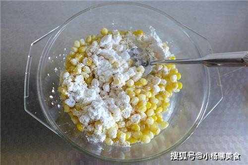 步驟1:先備上一個乾淨的碗,然後將事先煮好的玉米拿出,接著將剝好的熟玉米放入到碗中,同時拿出澱粉以及煉乳,將這兩樣食材都倒入玉米中,然後將它們一起攪拌均勻後就將拌好的玉米放在一旁備用。