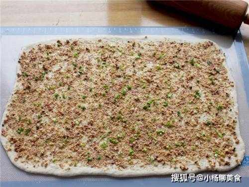 步骤2:接着开始做花生酱,起锅将70g的花生倒入锅中炒,将它炒香后就捞出,并且将花生和1g花椒和2g盐一起弄碎。接着在碾碎的花生花椒中加上20g的油,并且简单的搅拌一会之后就可以做成花生酱了。这时候面团也就好了,接着面团排气后就擀成一个大面饼,并且将刚才的花生酱抹在上面,还可以加上一点葱花。