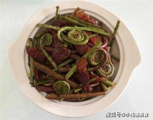 1、五花肉一小塊、辣椒三個(不辣)、蕨菜掐掉折不斷的部分,其它全部折成段,不要用刀切。2、蕨菜先焯下水撈出瀝幹。3、五花肉先煸炒出油分,再下紅椒和蕨菜翻炒。4、加一點水燜一下後入醬油、蚝油、鹽、糖調味。