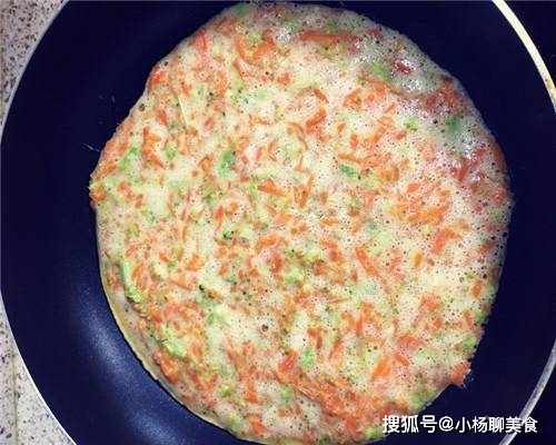 步骤3:将锅烧热,并且倒入适量的油,接着将刚才拌匀的糊倒入锅中,同时趁着液体还能流动,就晃动锅,让液体快速的流向锅内。然后开始煎,等到一面已经开始凝固了之后就翻面,接着在煎到两面都金黄后就可以捞出,等到全部都煎好后就能吃了。