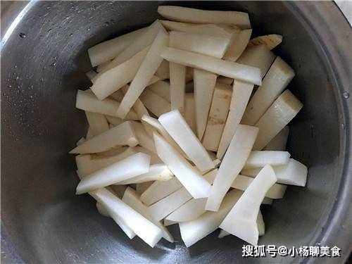 步驟1:半斤的蘿蔔全部都倒入水中,接著開始挨個的清洗,一定要清洗乾淨,因為是不削皮的。等到所有的蘿蔔都清洗乾淨之後就在菜板上,同時挨個的開始切蘿蔔。將蘿蔔先攔腰切斷,然後開始將蘿蔔切成小條狀,並且切好的蘿蔔要放入盆中。