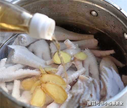 步驟2:在鍋內倒入適量的清水,接著倒入雞爪,並且加上生薑以及鹽,最後倒上料酒,如果水不能沒過雞爪就得一點水。接著開大火,當看到鍋中的水開咕嚕咕嚕後就用小火開始煮,在10分鐘之後就可以關上火,然後撈出雞爪。