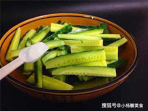 步驟2:接著準備一個沒有水油,並且乾淨的大碗中,然後將黃瓜放入碗中,同時加上2勺鹽,簡單的拌一下後,將黃瓜放在一旁醃制上6個小時的樣子。等到再次拿出,黃瓜就會出非常多的水。這時候我們就可以將切上一些大以及薑片和辣椒。